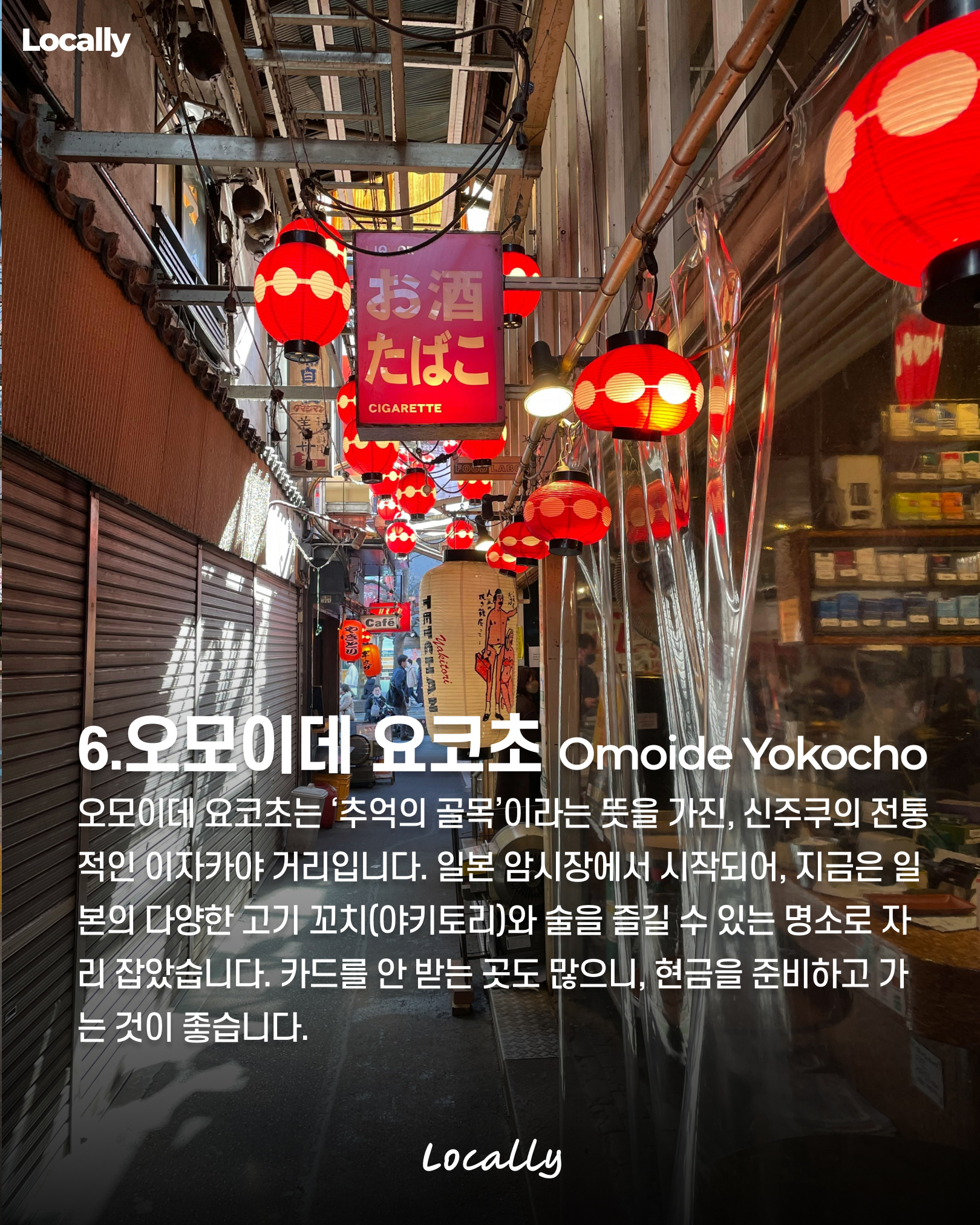 오모이데 요코초는 ‘추억의 거리’라는 뜻을 가진, 신주쿠의 전통적인 이자카야 거리입니다. 일본 암시장에서 시작되어, 지금은 일본의 다양한 고기 꼬치(야키토리)와 술을 즐길 수 있는 명소로 자리 잡았습니다. 카드를 안 받는 곳도 많으니, 현금을 준비하고 가는 것이 좋습니다.