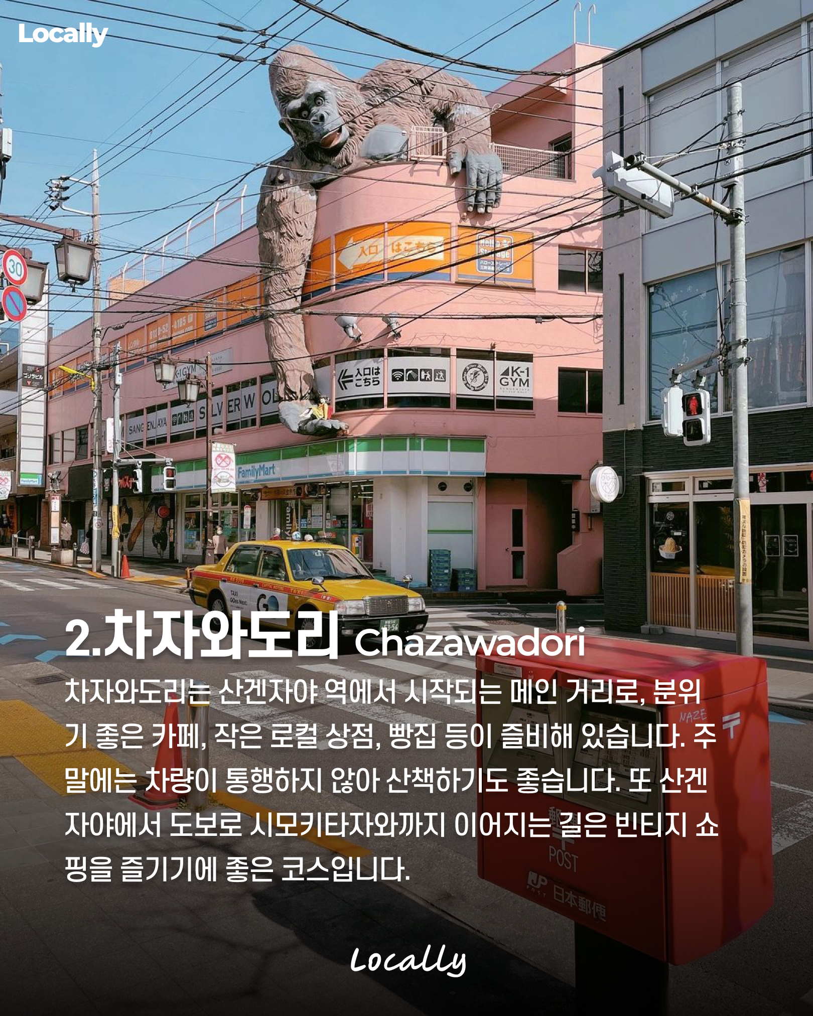차자와도리는 산겐자야 역에서 시작되는 메인 거리로, 분위기 좋은 카페, 작은 로컬 상점, 빵집 등이 즐비해 있습니다. 주말에는 차량이 통행하지 않아 산책하기도 좋습니다. 또 산겐자야에서 도보로 시모키타자와까지 이어지는 길은 빈티지 쇼핑을 즐기기에 좋은 코스입니다.