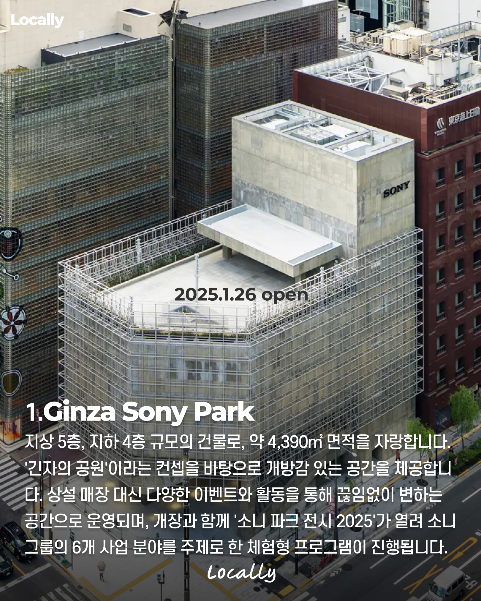 📆2025.01.26 지상 5층, 지하 4층 규모의 건물로, 약 4,390㎡ 면적을 자랑합니다. ’긴자의 공원‘이라는 컨셉을 바탕으로 개방감 있는 공간을 제공합니다. 상설 매장 대신 다양한 이벤트와 활동을 통해 끊임없이 변하는 공간으로 운영되며, 개장과 함께 ’소니 파크 전시 2025‘가 열려 소니 그룹의 6개 사업 분야를 주제로 한 체험형 프로그램이 진행됩니다.