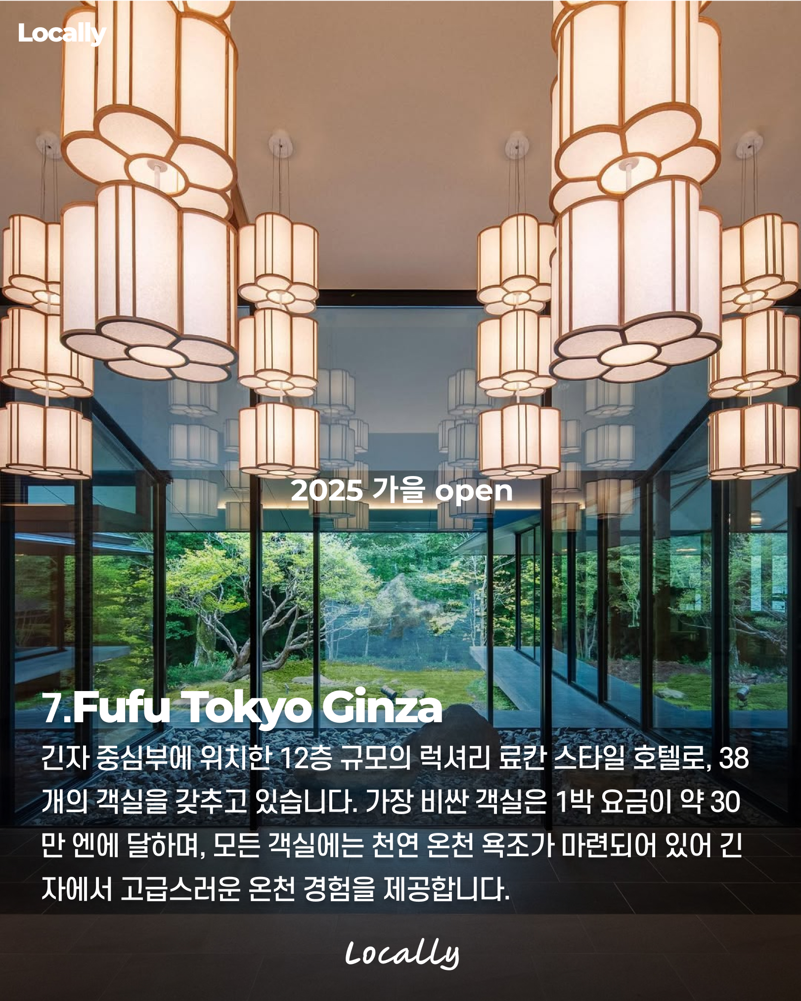 📆2025년 가을 긴자 중심부에 위치한 12층 규모의 럭셔리 료칸 스타일 호텔로, 38개의 객실을 갖추고 있습니다. 가장 비싼 객실은 1박 요금이 약 30만 엔에 달하며, 모든 객실에는 천연 온천 욕조가 마련되어 있어 긴자에서 고급스러운 온천 경험을 제공합니다.