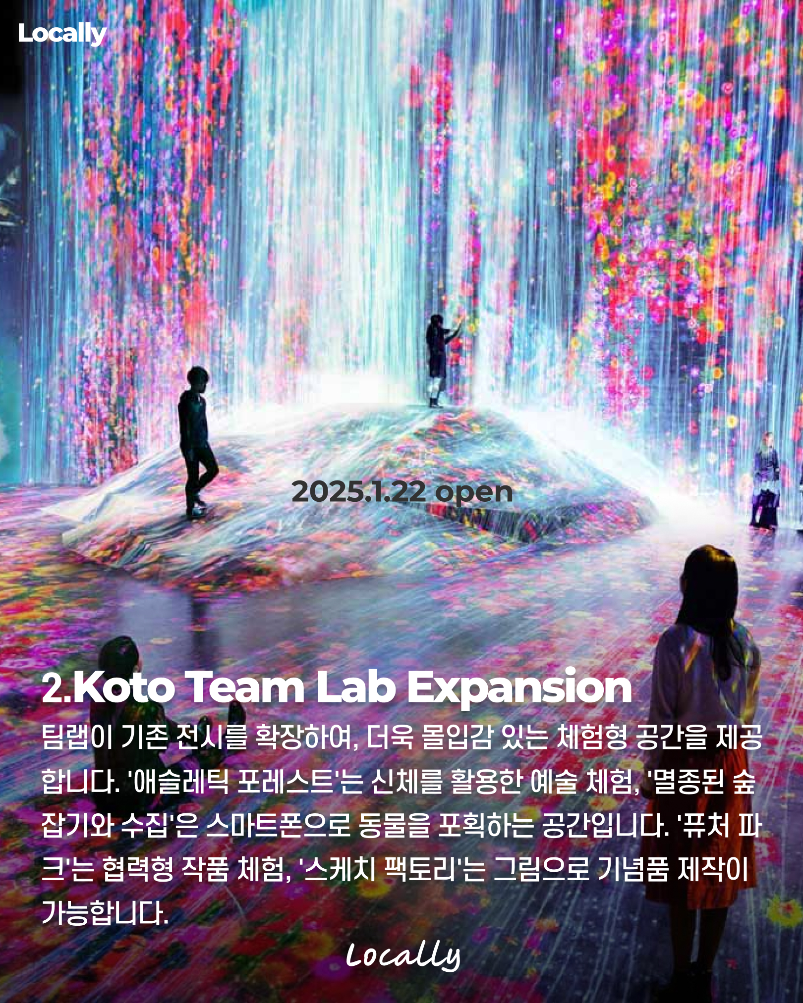 📆2025.01.22 팀랩 플래닛이 1.5배 확장되며, 10개 이상의 새로운 작품을 선보입니다. ’애슬레틱 포레스트‘는 복잡한 3D 공간에서 신체를 사용해 예술을 체험하는 공간이며, ’멸종된 숲 잡기와 수집‘에서는 스마트폰을 이용해 멸종된 동물을 관찰하고 포획할 수 있습니다. ’퓨처 파크‘는 관람객들이 작품을 함께 만들어가는 협력형 공간이고, ’스케치 팩토리‘에서는 자신이 그린 그림으로 기념품을 만들 수 있습니다.