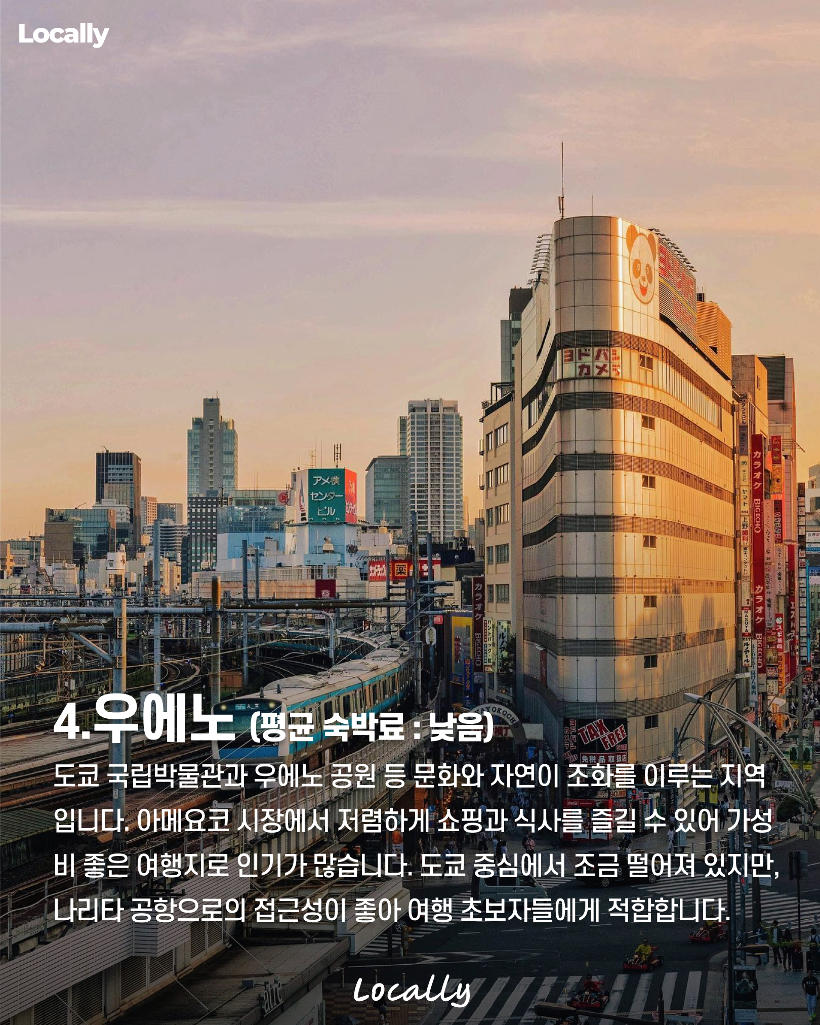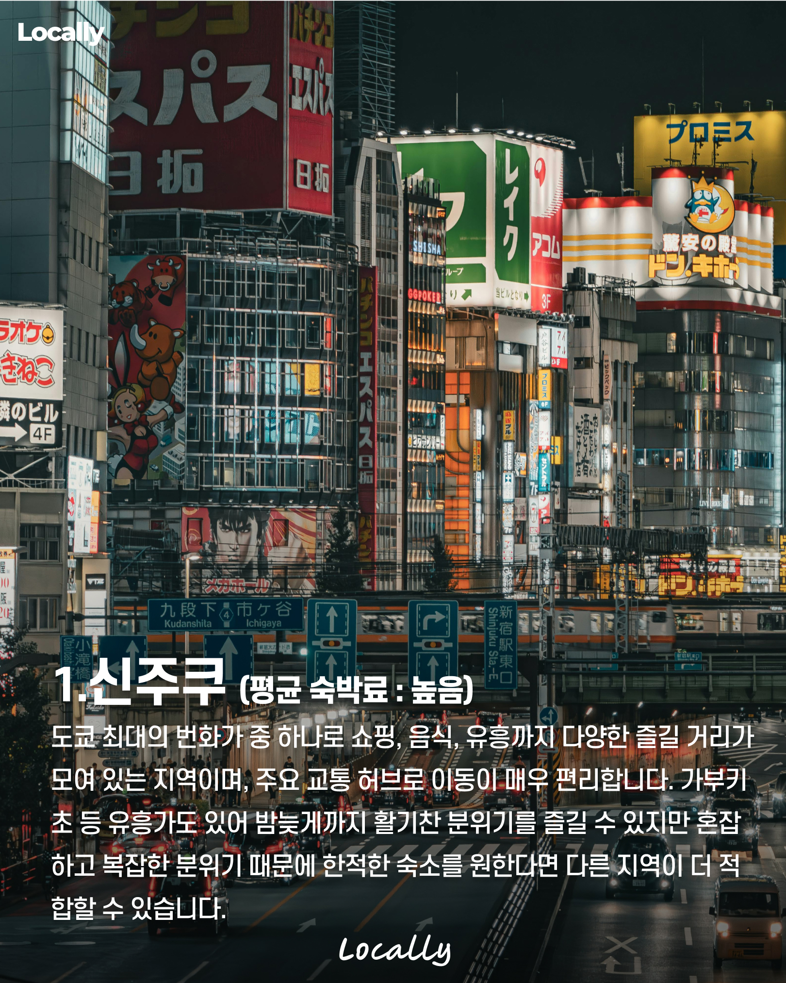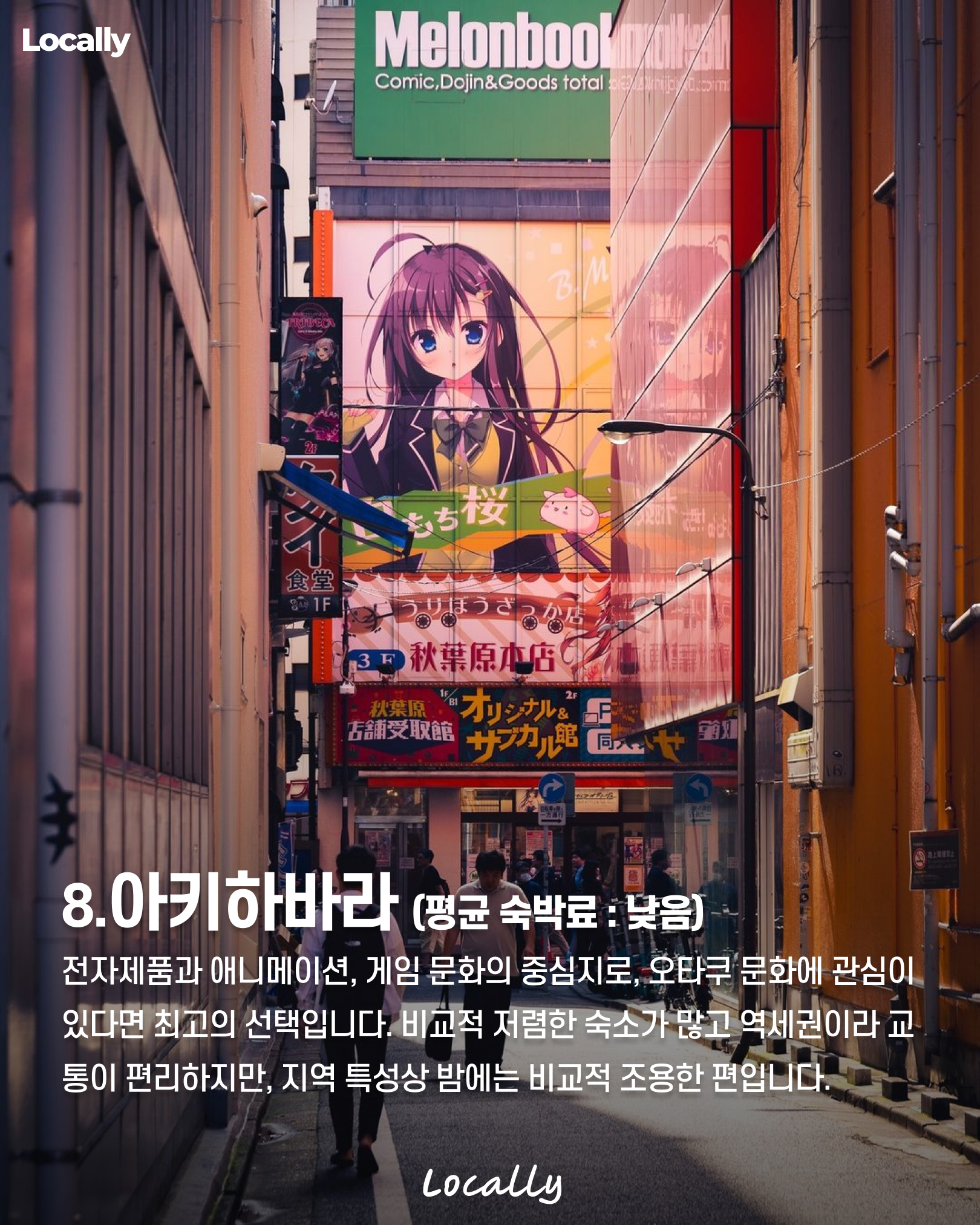 전자제품과 애니메이션, 게임 문화의 중심지로, 오타쿠 문화에 관심이 있다면 최고의 선택입니다. 비교적 저렴한 숙소가 많고 역세권이라 교통이 편리하지만, 지역 특성상 밤에는 비교적 조용한 편입니다.