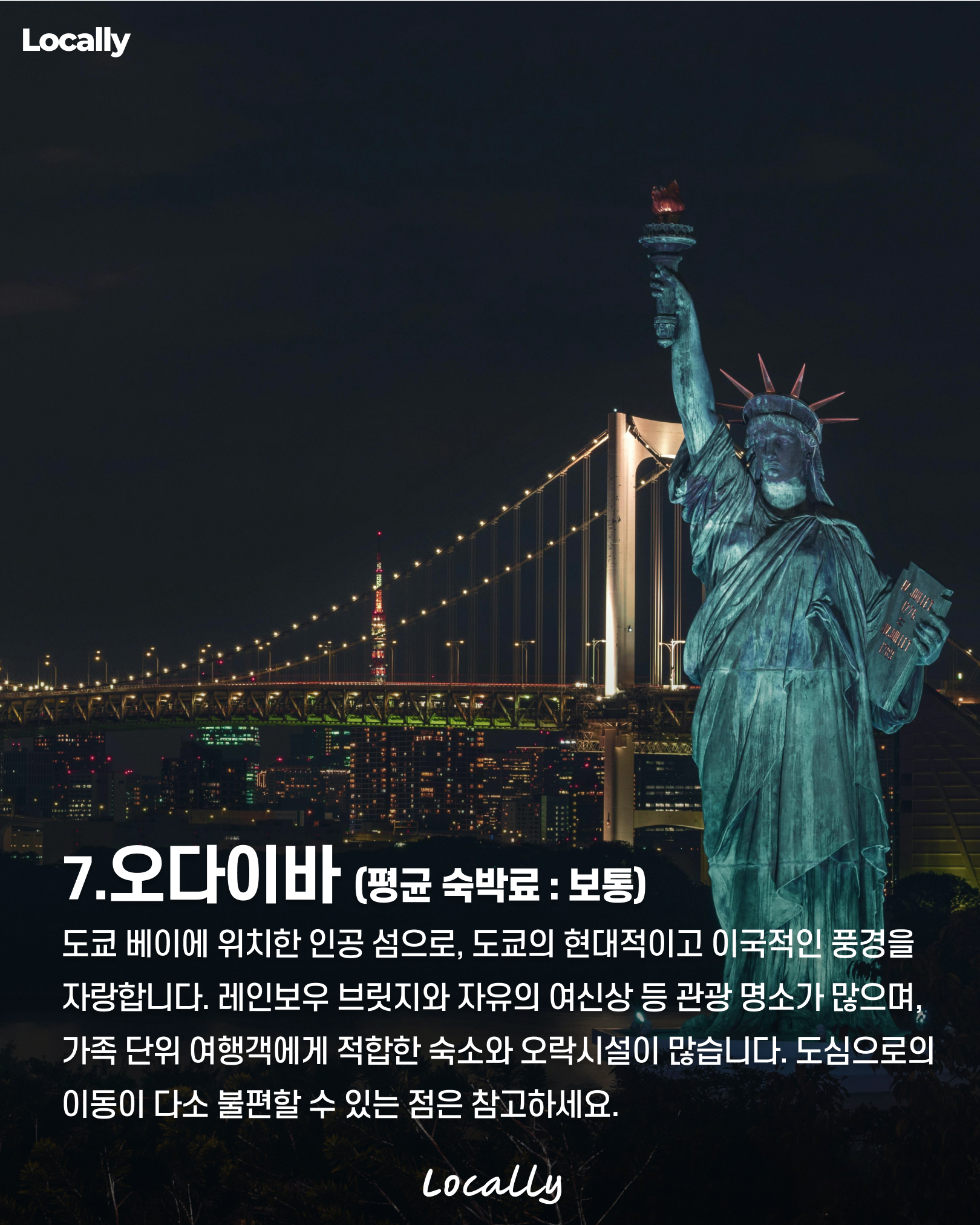 도쿄 베이에 위치한 인공 섬으로, 도쿄의 현대적이고 이국적인 풍경을 자랑합니다. 레인보우 브릿지와 자유의 여신상 등 관광 명소가 많으며, 가족 단위 여행객에게 적합한 숙소와 오락시설이 많습니다. 도심으로의 이동이 다소 불편할 수 있는 점은 참고하세요.
