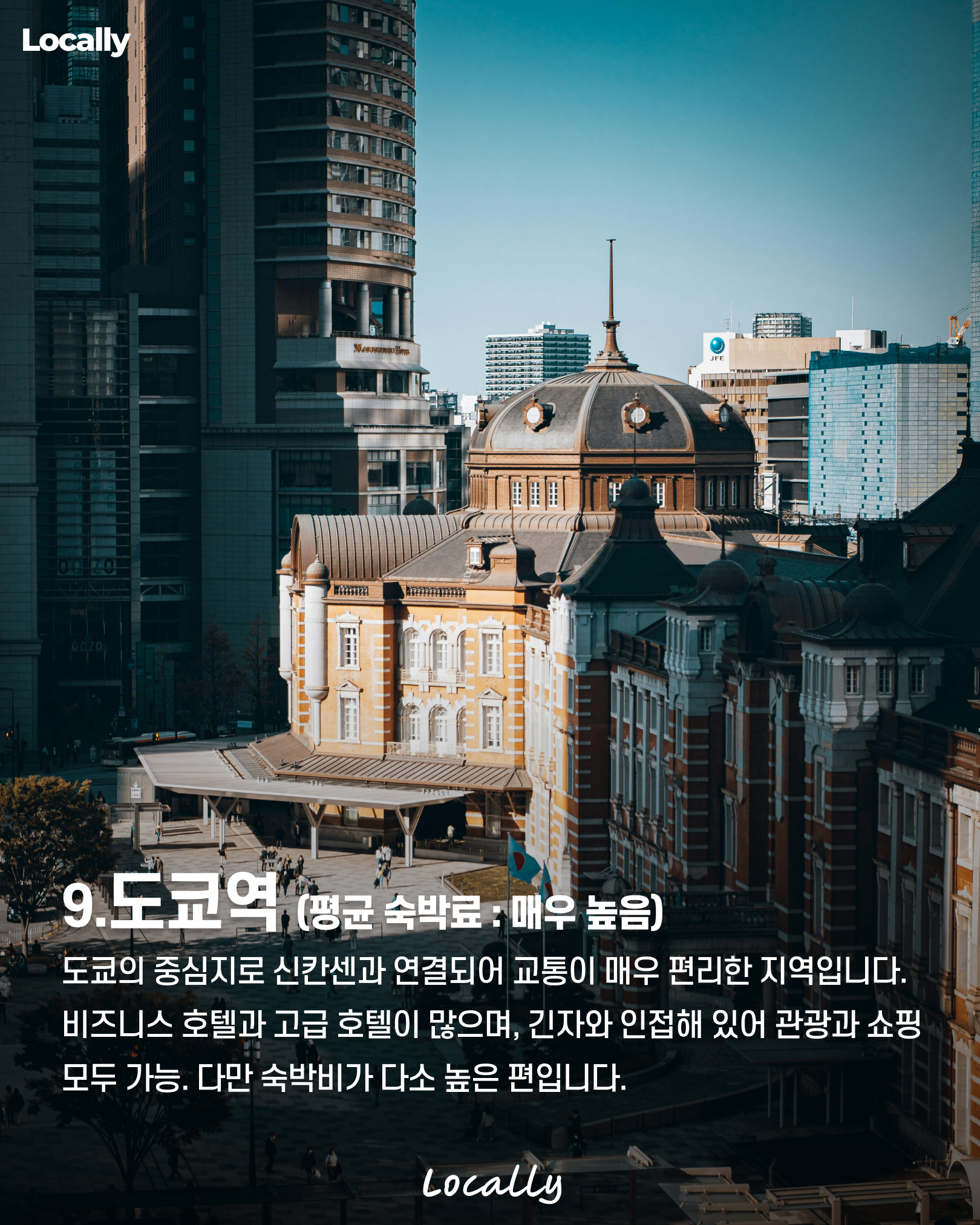 도쿄의 중심지로 신칸센과 연결되어 교통이 매우 편리한 지역입니다. 비즈니스 호텔과 고급 호텔이 많으며, 긴자와 인접해 있어 관광과 쇼핑 모두 가능. 다만 숙박비가 다소 높은 편입니다.