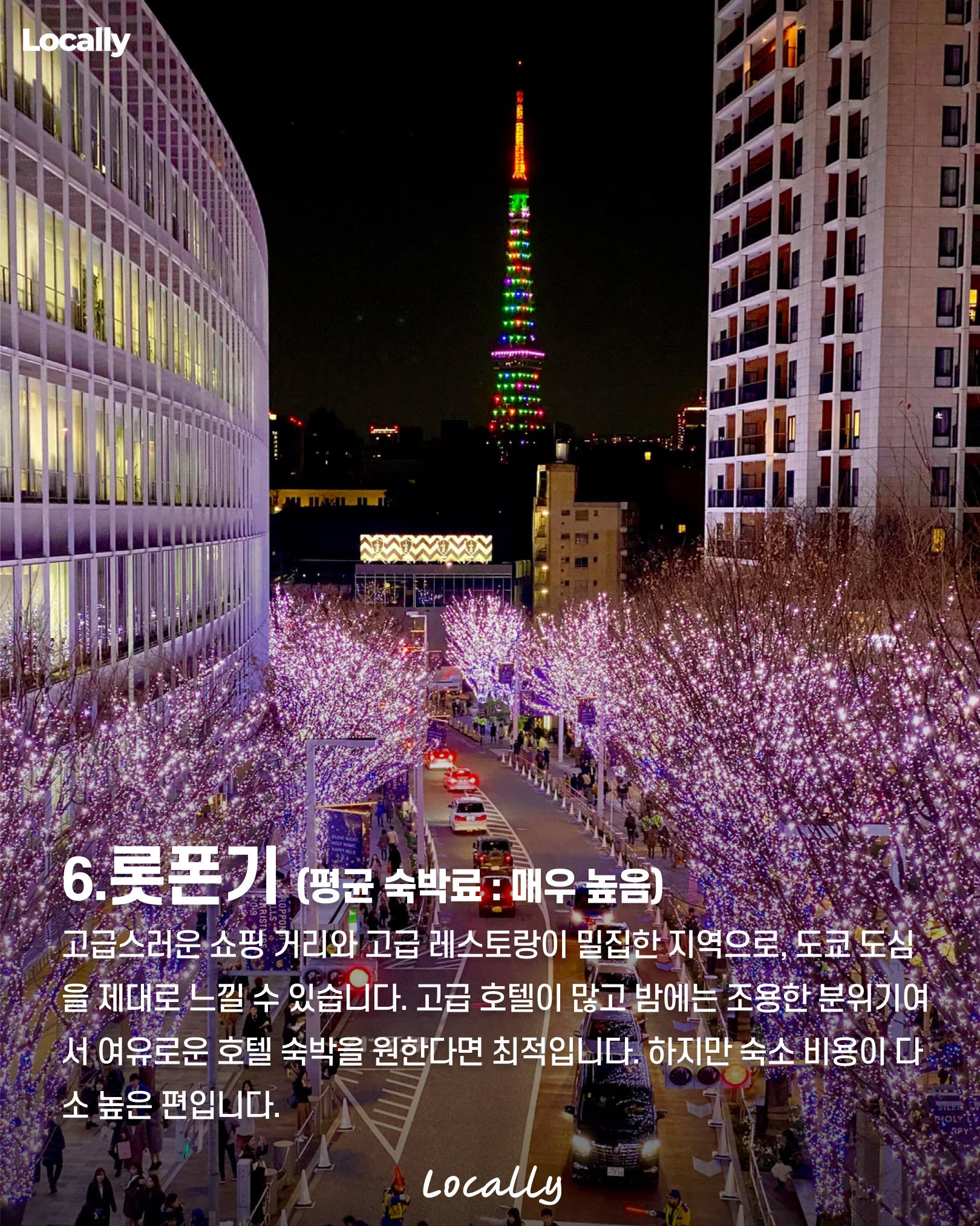 국제적인 분위기를 가진 지역으로 외국인들에게도 인기 있는 곳입니다. 도쿄타워, 롯폰기 힐즈,고급 클럽과 , 미술관 등이 있어 세련된 도쿄의 문화를 즐기기에 좋습니다. 하지만 숙소 비용이 다소 높은 편입니다.