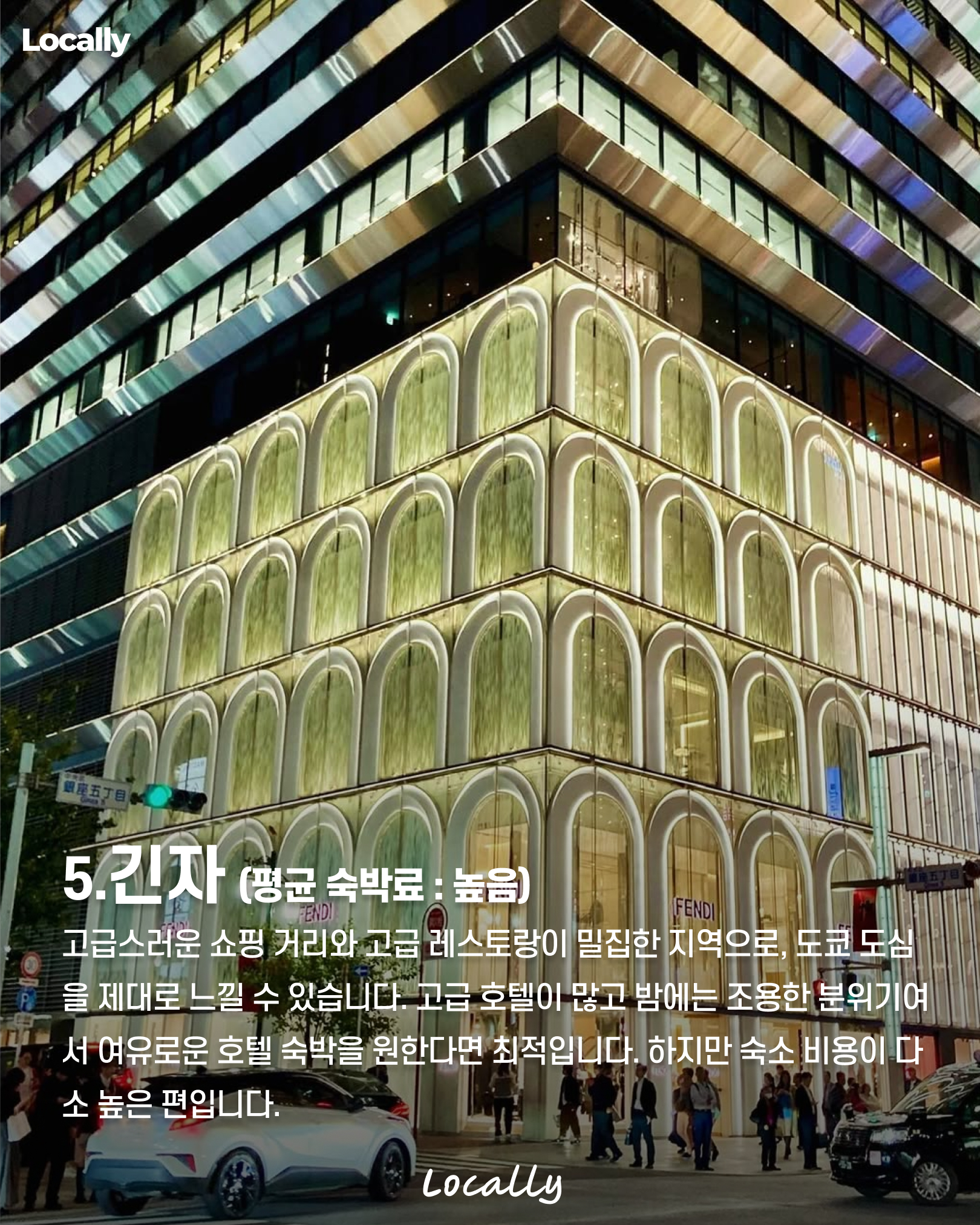 고급스러운 쇼핑 거리와 고급 레스토랑이 밀집한 지역으로, 도쿄 도심을 제대로 느낄 수 있습니다. 고급 호텔이 많고 밤에는 조용한 분위기여서 여유로운 호텔 숙박을 원한다면 최적입니다. 하지만 숙소 비용이 다소 높은 편입니다.