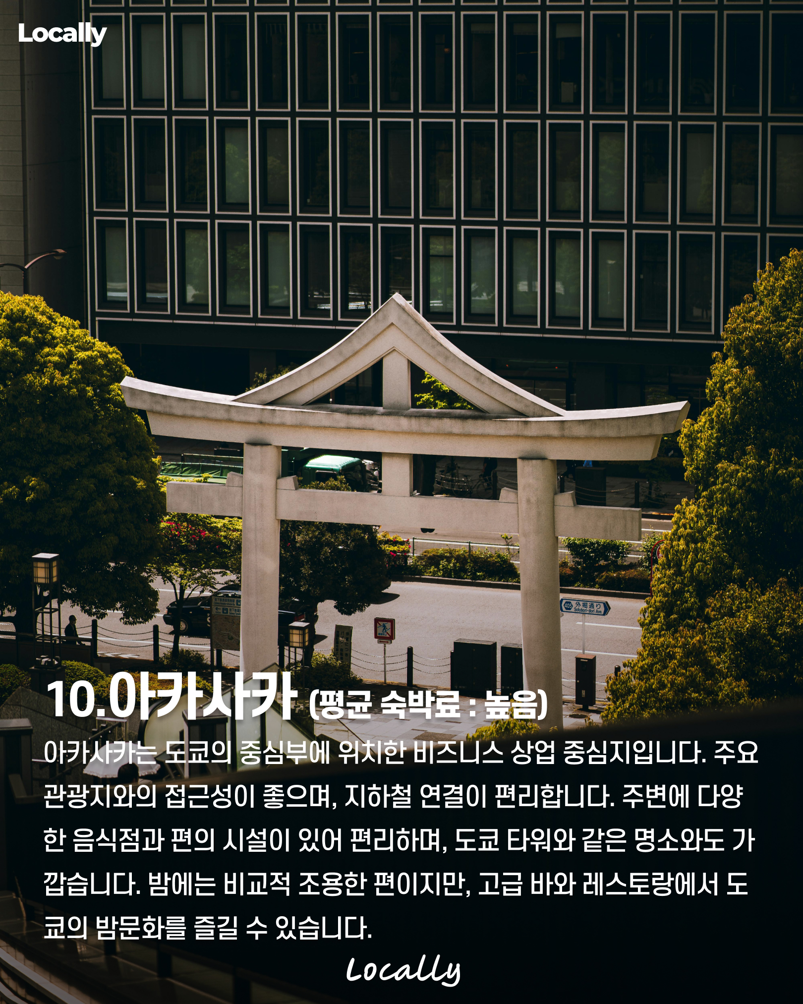 아카사카는 도쿄의 중심부에 위치한 비즈니스 상업 중심지입니다. 주요 관광지와의 접근성이 좋으며, 지하철 연결이 편리합니다. 주변에 다양한 음식점과 편의 시설이 있어 편리하며, 도쿄 타워와 같은 명소와도 가깝습니다. 밤에는 비교적 조용한 편이지만, 고급 바와 레스토랑에서 도쿄의 밤문화를 즐길 수 있습니다.