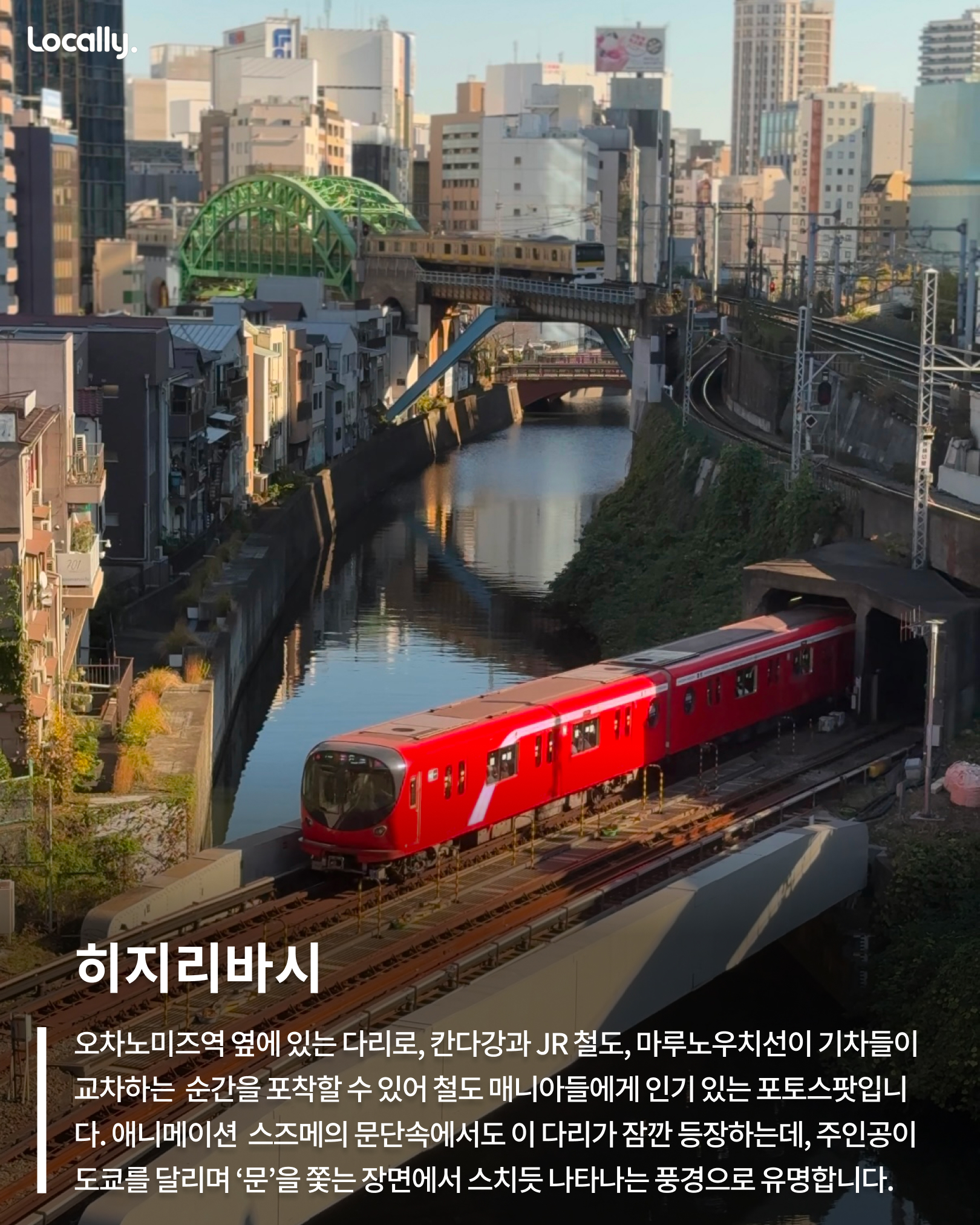 오차노미즈역 옆에 있는 다리로, 칸다강과 JR 철도, 마루노우치선이 교차하는 복합적 도시 풍경을 감상할 수 있어요. 특히 기차가 지나가는 순간을 포착할 수 있어 철도 마니아나 사진 애호가들에게 인기 있는 포토스팟입니다. 애니메이션 『스즈메의 문단속』에서도 이 다리가 잠깐 등장하는데, 주인공이 도쿄를 달리며 ‘문’을 쫓는 장면에서 스치듯 나타나는 풍경으로 팬들 사이에선 성지로 알려져 있습니다.
