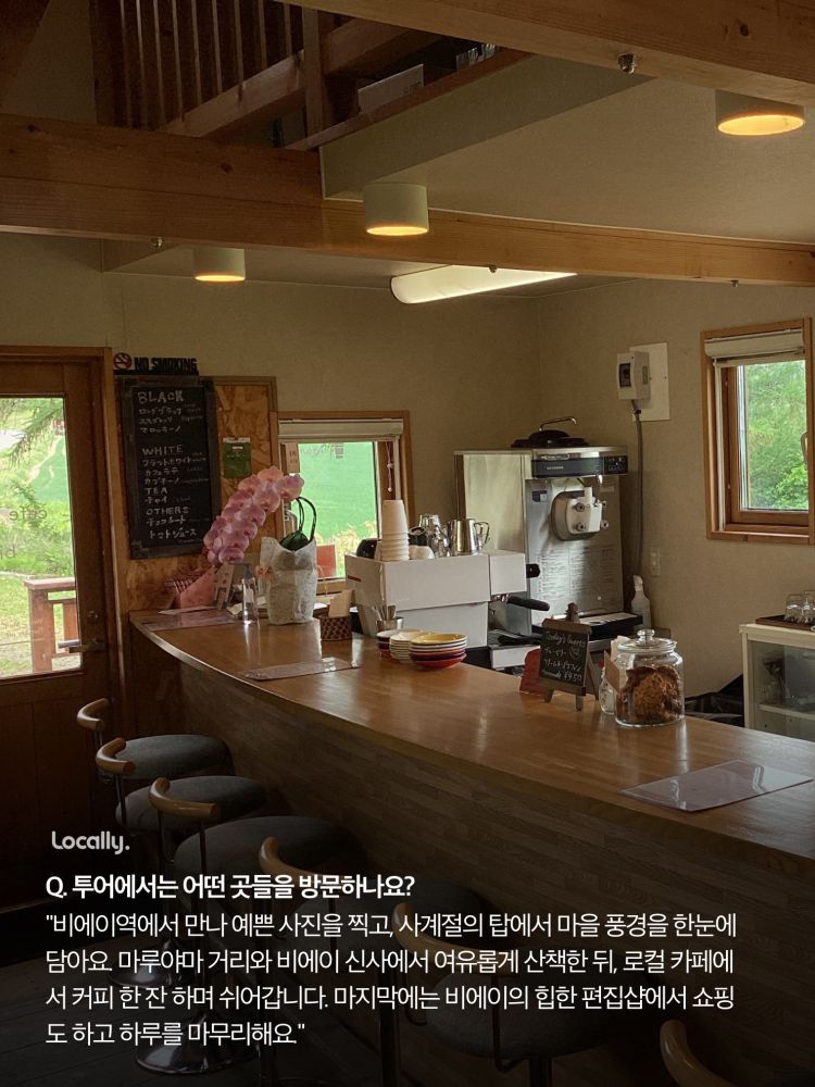 이번 투어에서는 비에이역 근처를 중심으로 제가 평소 좋아하는 로컬 스팟들을 천천히 걸으며 소개해드릴게요. 관광지처럼 바쁘게 돌아다니는 게 아니라, 현지인의 시선으로 여유롭게 산책하듯 둘러보는 시간이 될 거예요!🩵