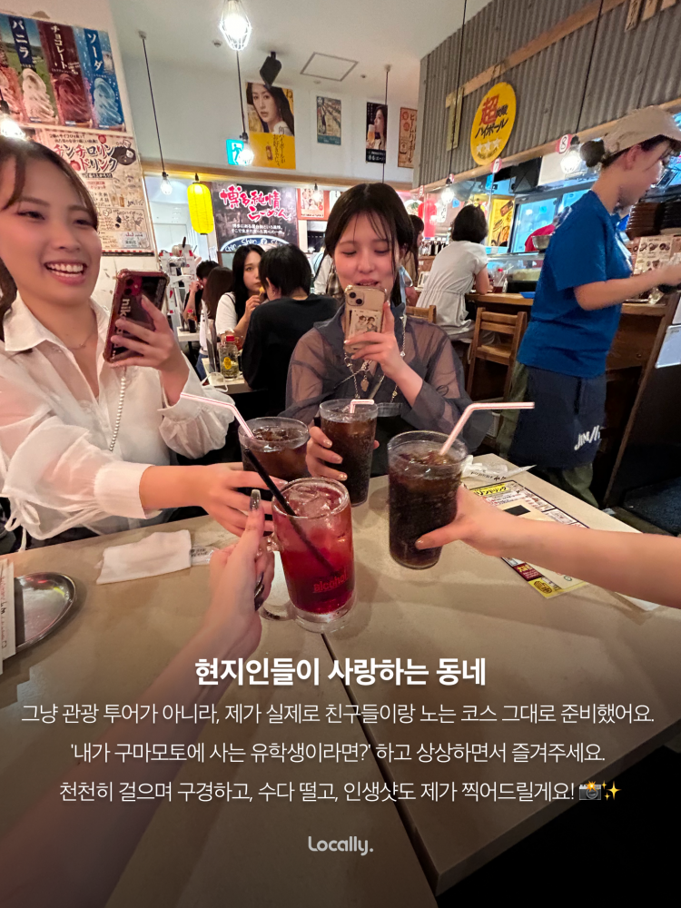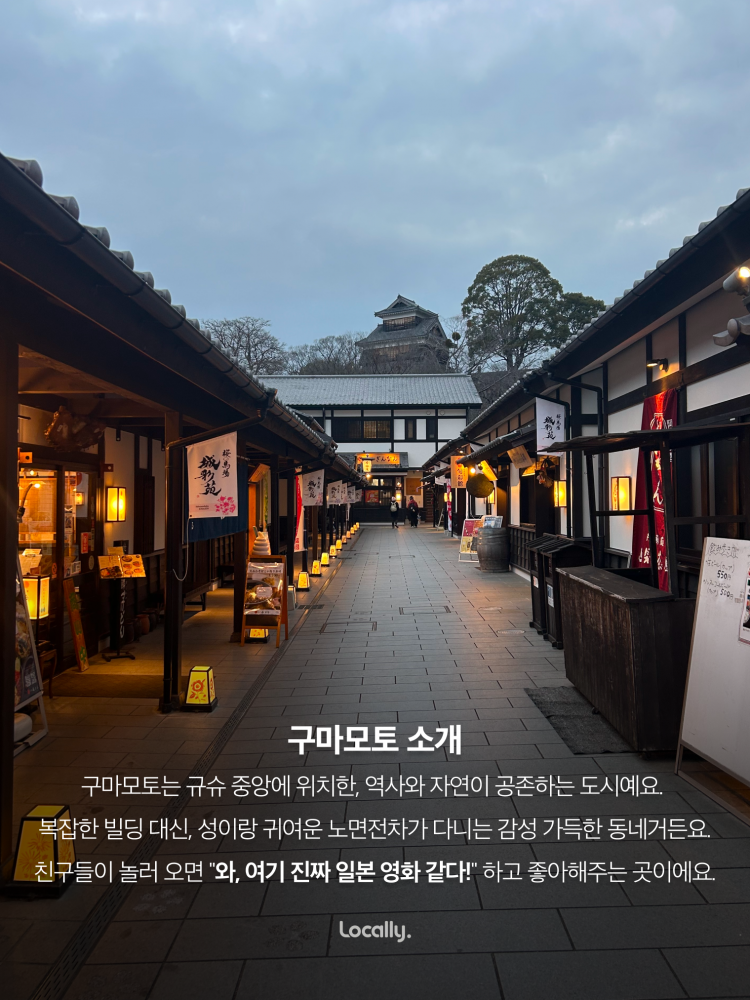 이 투어는 ‘가이드북에 나오는 관광지’ 보다, 구마모토에 사는 현지인의 시선으로 구마모토의 과거와 현재의 일상을 오가는 시간 여행 같은 코스로 준비해봤어요! 구마모토성의 역사적인 이야기부터, 로컬한 노면전차를 타고 이동하며 마주하는 평범하지만 진짜 구마모토의 풍경, 그리고 현지 사람들이 자연스럽게 모이는 골목과 술집까지🍶 가이드북에는 없는 진짜 구마모토를 함께 걸어볼게요 🚋✨