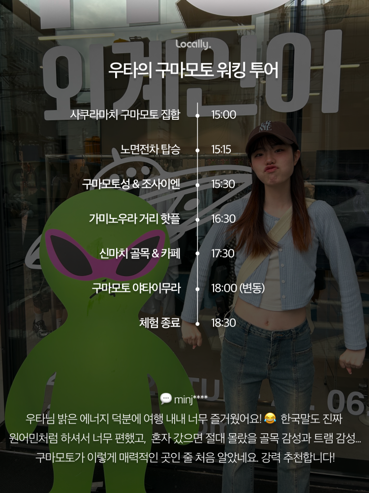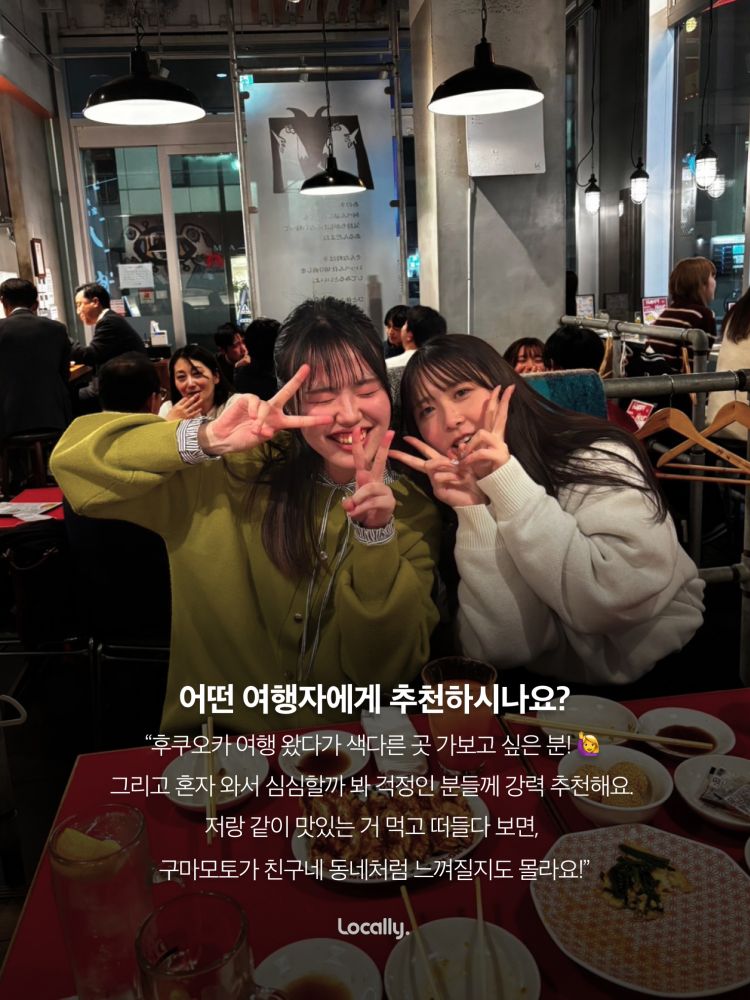 ▪️ 우타 호스트의 한 마디: 안녕하세요🙋🏻♀️ 구마모토의 대학생 우타라고 합니다! 한국과 일본을 연계하는 마케터가 되고 싶어서 현재 대학교에서 열심히 공부중입니다:) 한국의 문화나 음식, 사람 등 다양하게 좋아해서 구마모토를 찾아오시는 한국분들에게 구마모토의 진짜 매력을, 현지인의 시선으로 재밌게 소개해드리고 싶어요! ✨