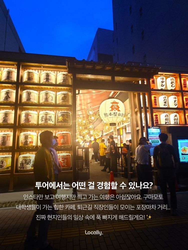 하루를 마무리하는 곳은, 학생과 직장인들이 한 잔 하러 자연스럽게 모이는 로컬 술집 거리예요. 구마모토의 술 문화, 분위기, 그리고 사람들. 원하시면 무알코올도 가능해요! 여행자가 아닌, 잠시 구마모토에 살다 가는 기분으로 마무리합니다 🍻