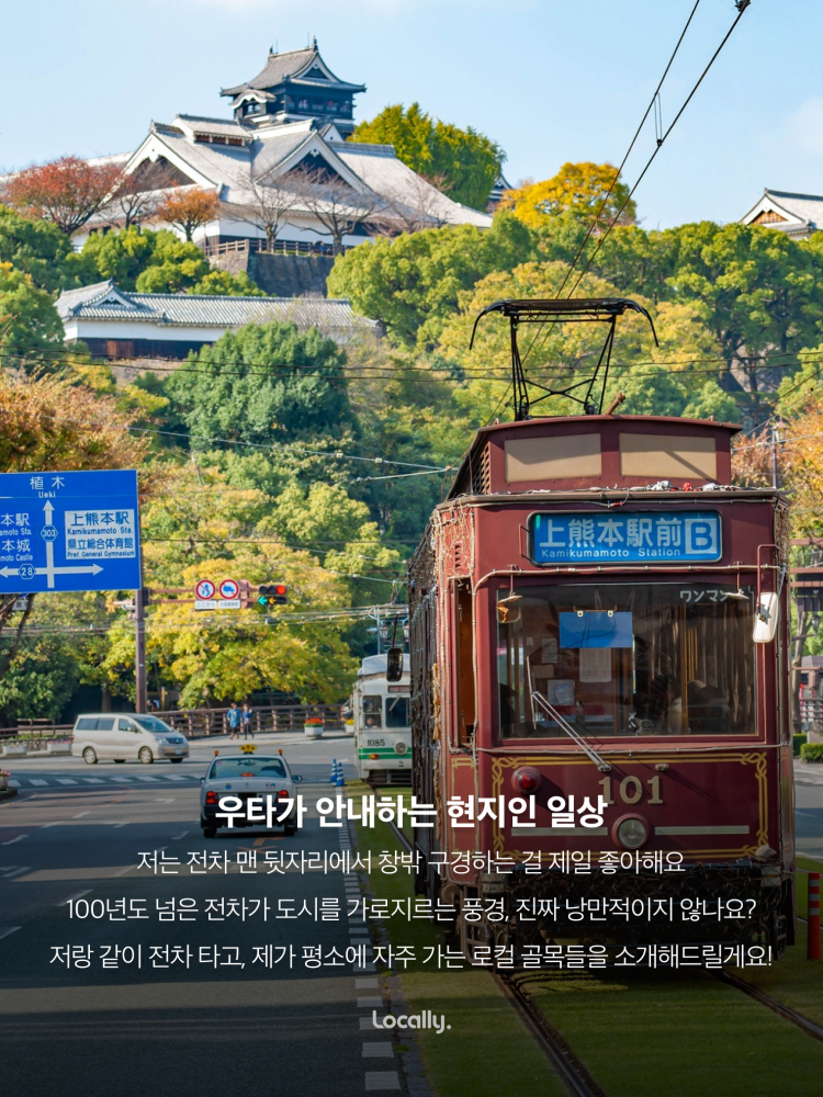 관광버스 대신 현지인들이 매일 이용하는 노면전차를 타고 이동해볼게요! 여기서 창문 밖으로 보이는 풍경을 구경하며, 관광지가 아닌, 제가 사는 구마모토의 진짜 일상을 즐기실 수 있어요! 한국에는 없는 교통수단이라 색다른 경험이 될 거예요.