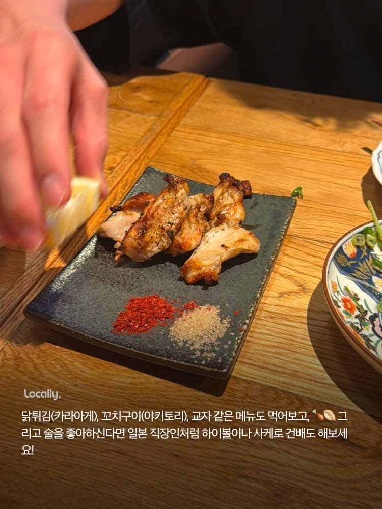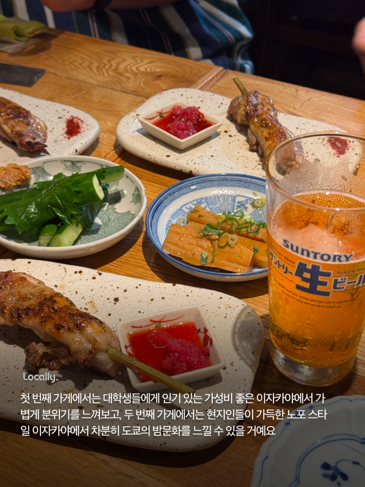 그 다음은 시부야의 숨겨진 로컬 노포 이자카야로 가요! 이곳은 현지인들에게 사랑받는 전통 이자카야로, 오랜 역사를 자랑하는 가게예요. 아늑한 분위기에서 해산물, 맛있는 교자, 야키토리 등을 즐길 수 있어요!