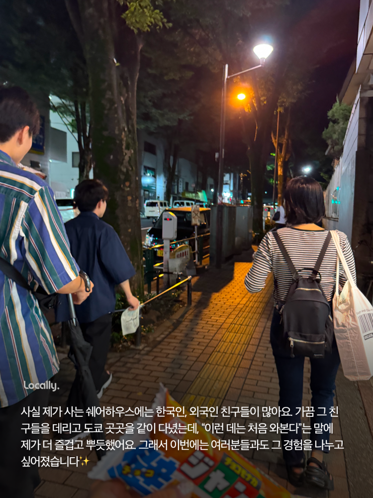 ▪️ 하루카 호스트의 한 마디: 쉐어하우스에 살면서 외국인 친구들에게 일본 곳곳을 안내해준 적이 많았는데, 그게 정말 즐거운 경험이었어요:) 그래서 로컬리를 통해 도쿄 도심에 숨겨진 로컬 매력을 더 많은 분들께 소개해 드리고 싶어요! 😊