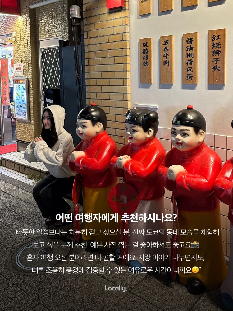 안녕하세요! 도쿄에서 IT 엔지니어로 일하고 있는 노아입니다 :) 이번 투어는 관광지보다는 도쿄 로컬들의 일상에 가까운 동네, 이케가미를 천천히 걸으며 즐기는 워킹 투어예요. 역사 깊은 사찰과 정겨운 상점가, 조용한 강변 산책로까지 바쁘지 않게 걷다 보면 도쿄의 차분하고 따뜻한 분위기를 자연스럽게 느끼실 수 있어요 🌿